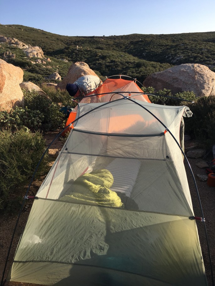 Aber nichts da. Sobald wir wieder auf dem Trail waren, war der Wind weg und ich habe wieder die ganze Hitze gemerkt. Also schleppte ich mich noch ein paar Meilen den Berg hoch bis wir an Meile 55,9 einen wunderschönen Zeltplatz fanden. Es waren noch ein paar andere Hiker um uns versammelt.