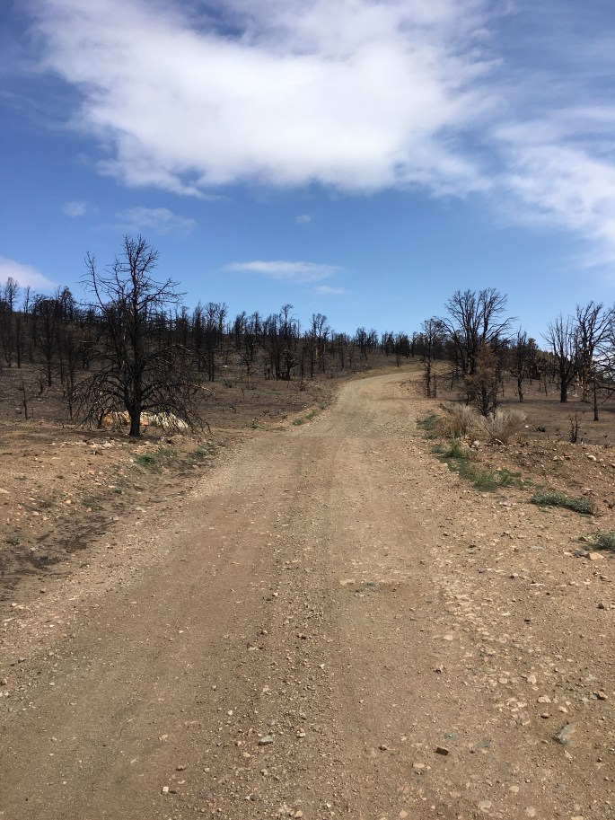 Nach den ersten Meilen mussten wir eine Alternativstrecke laufen, da der PCT hier auf Grund eines Brandes noch gesperrt ist. Wir liefen über Schotterstraßen, vorbei an dem abgebrannten Gebiet.