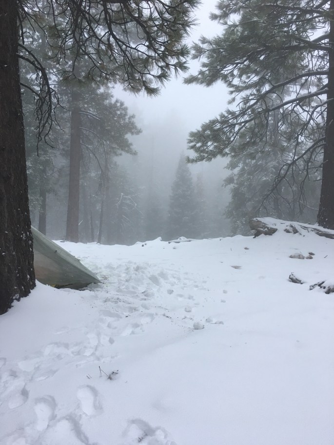 In der Nacht bin ich ein mal wach geworden und fragte mich wieso es im Zelt so dunkel ist. Bisher fiel immer etwas Mondlicht ins Zelt. Dann hörte ich wie der angekündigte Schnee auf mein Zelt prasselte. Im Halbschlaf fing ich also an mein Zelt abzuklopfen und es hörte sich so an, als würde sehr sehr viel Schnee an den Seiten runterfallen. Plötzlich war es auch wieder etwas heller in meinem Zelt. Ich muss wirklich gut eingeschneit gewesen sein.