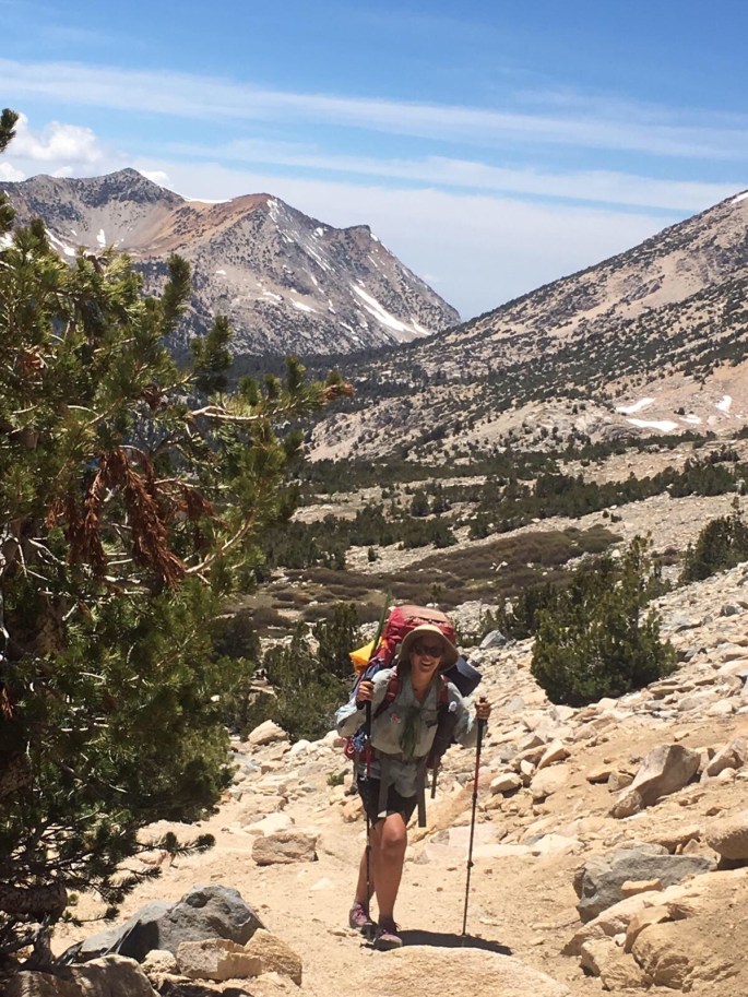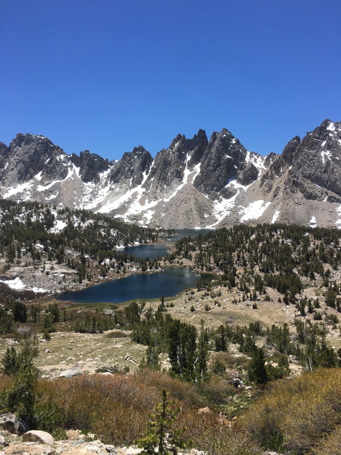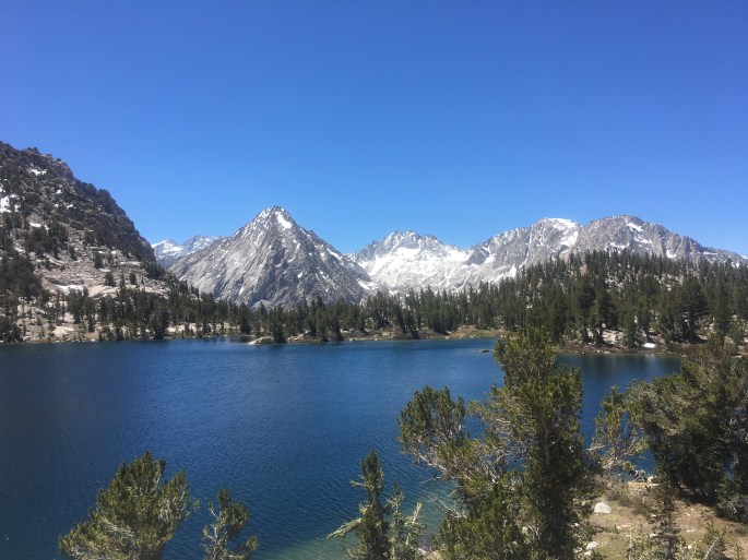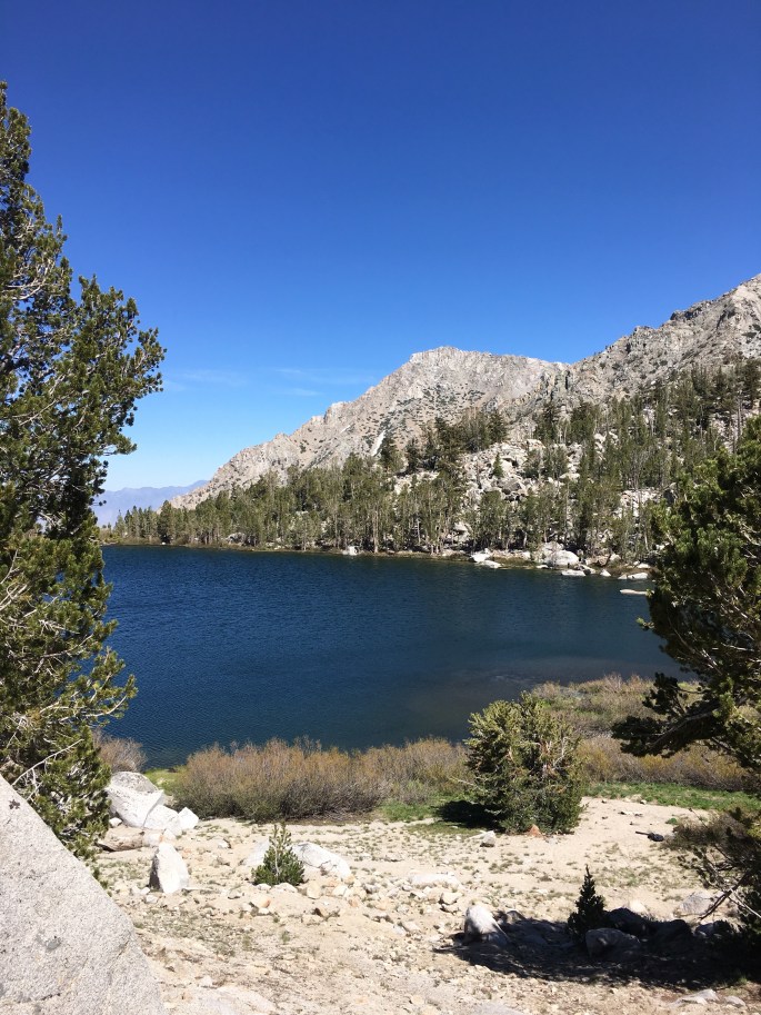 Nach dem wir am Morgen einen Fluss überqueren mussten (über Steine und einen umgekippten Baum), kamen wir nach circa 4 Meilen an einer Weggabelung vorbei. Von hier aus kann man an dem Bullfrog Lake vorbei zum Kearsarge Pass laufen um dann von da aus ins Onion Valley abzusteigen. Dort gibt es einen Zeltplatz und auf dem Weg dorthin kommt man an schönen Seen vorbei. Viele Leute machen hierher Ausflüge. Es gibt also gute Möglichkeiten sich mit in eine der nächsten Städte nehmen zu lassen um neues Essen einzukaufen.