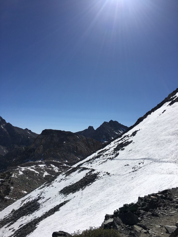 Heute überqueren wir den Glen Pass (11948ft). Wir hatten nur circa zwei Meilen Anstieg vor uns. Die kleinen Schneefelder auf dem Weg zum Pass konnte man gut ohne Microspikes überqueren, da der Schnee morgens noch fest war.