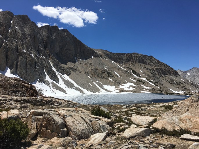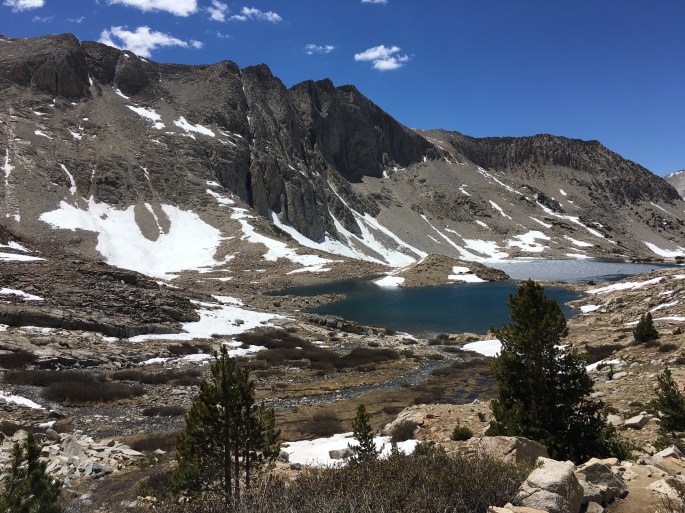 Wir machten schließlich Mittagspause zwischen zwei Seen, von denen einer noch eine leichte Eisschicht trug. Nach dem der Trail wieder sichtbar war, ging es angenehm Berg ab. Wir mussten zwei Flüsse überqueren und haben Marc wieder getroffen. Einen Hiker, den wir seit Wochen immer wieder treffen.