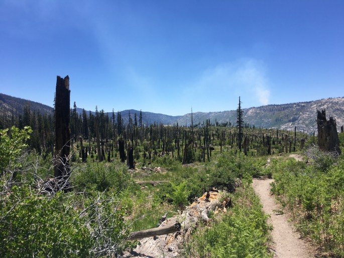Der Weg war zügig zu laufen. Es ging hauptsächlich Berg ab. Schließlich lief ich durch ein Gebiet, welches von einem Waldbrand gekennzeichnet wurde. Verkohlte Baumstämme ragten Richtung Himmel. Doch der Boden war bereits wieder voller Blumen und grüner Büsche. Auch neue Bäume wuchsen bereits und waren einige Meter hoch. Der Brand muss also schon lange her sein.