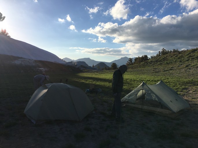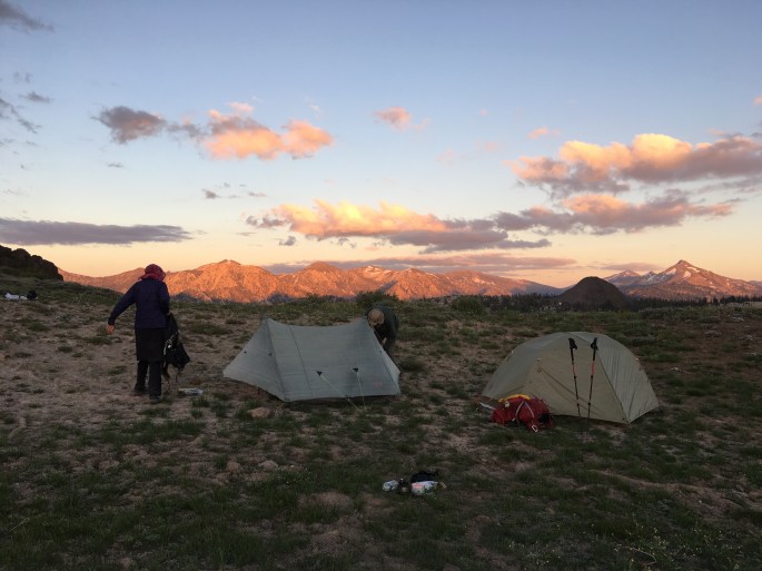 Nach insgesamt 18 Meilen schlugen wir unsere Zelte auf und hatten einen unglaubliche Ausblick auf die Berge und das schwarze Ungetüm an Gestein. Die Sonne ging unter und tauchte alles in ein rosa rotes Licht.