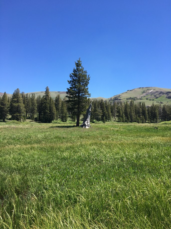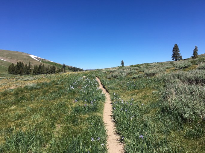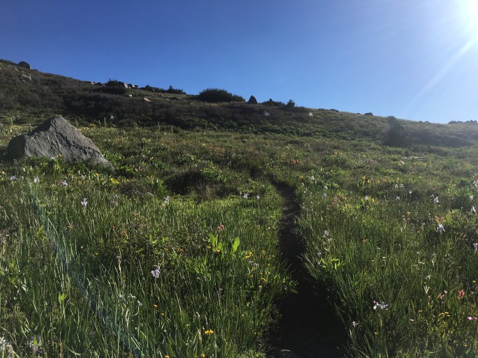 Heute früh sind wir auf den Carson Pass gestiegen. Der Weg dorthin führte am Berg entlang durch kniehohe Blumenfelder und Gräser. Ein kleines Schneefeld hatten wir auch zu überqueren, jedoch hätte jemand mit längeren Beinen als ich auch darüber hüpfen können.