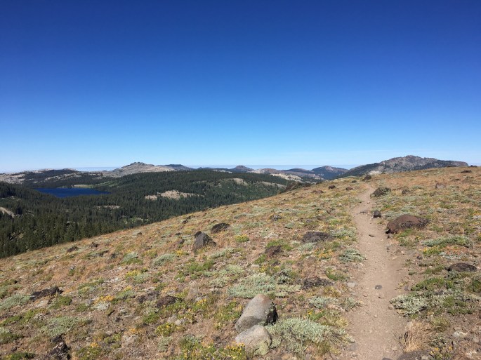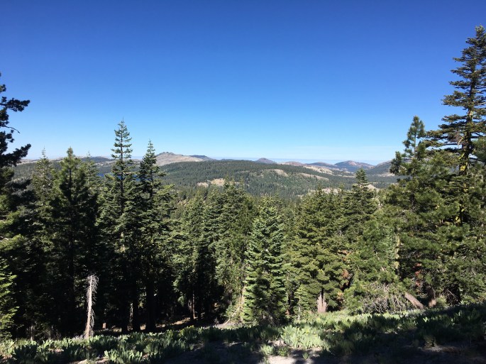 Heute führte uns der PCT über Bergkämme und Wälder. Wenn man auf dem Berg steht, hat man immer einen super tollen Ausblick! Wir konnten heute überall Seen sehen. Als kleine und große tiefblaue Flecken tauchten sie zwischen den Wäldern auf. Immer wieder ging es Berg auf und ab, jedoch kann ich wirklich merken, dass wir nicht mehr so hoch sind wir noch in der Sierra. In den letzten Tagen waren wir ein Mal über 9000ft und seit dem bewegen wir uns immer zwischen 6000-8000ft.