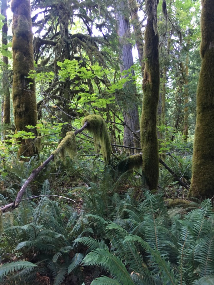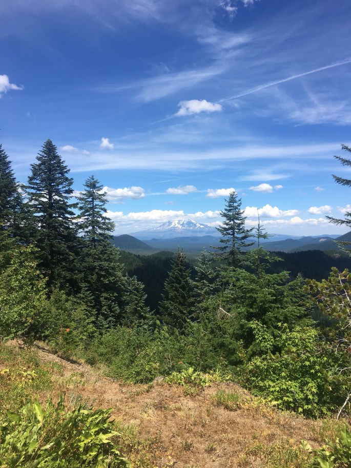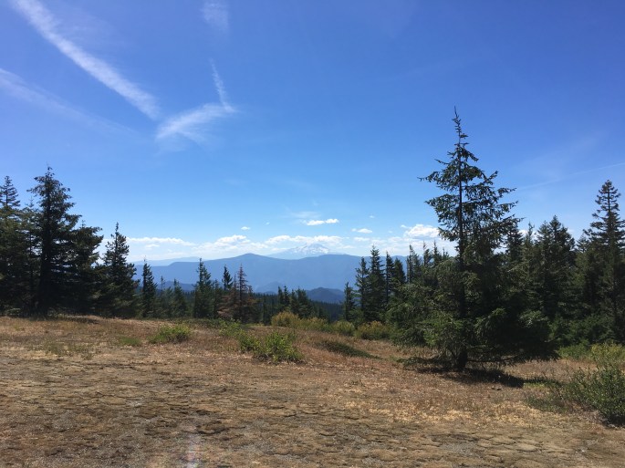 Rita, Glen und ich machen schließlich Mittagspause auf einem großen Plateau. Wir konnten Mt. Hood, der noch in Oregon ist, und Mt. Adams (Washington) sehen. Beide haben Schneehauben und dicke Wolken liegen auf der Spitze. Es ist ein toller Anblick!