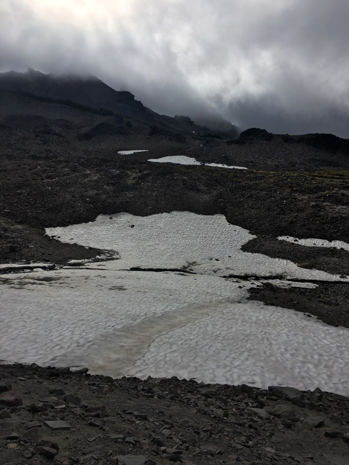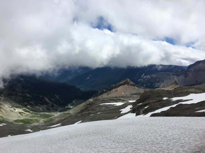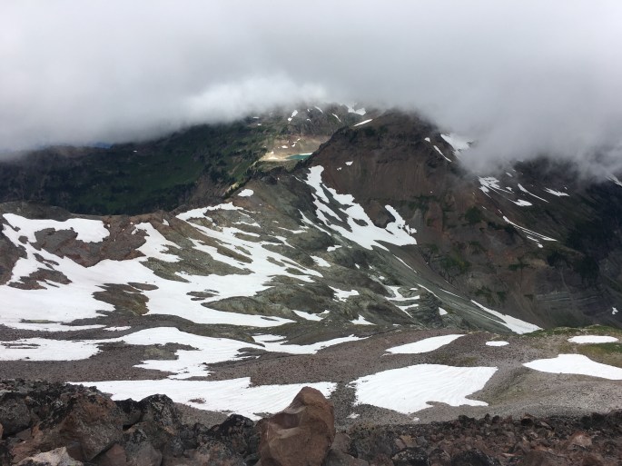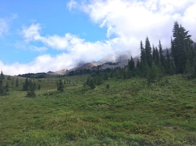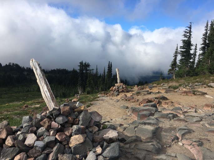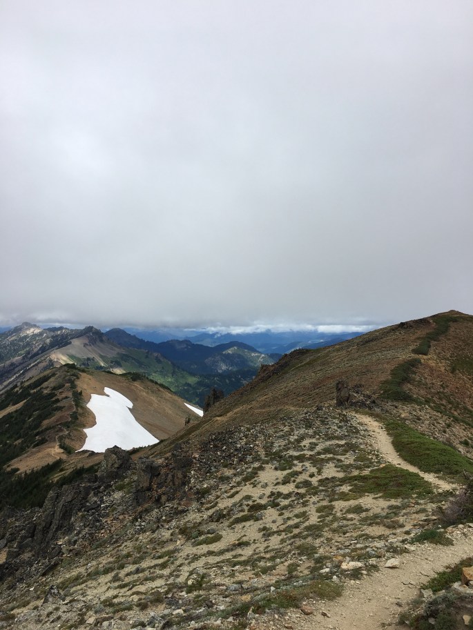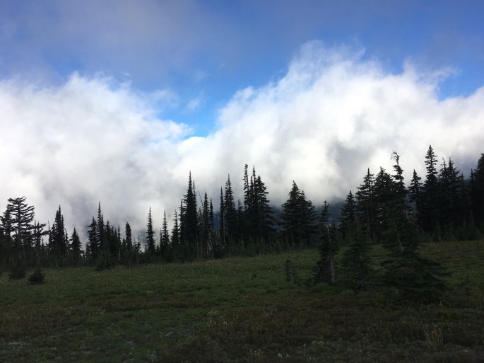 Wir liefen über die Goat Rocks. Immer weiter Berg auf und die Aussicht mit den Wolken, die tief um uns herum hingen, war unglaublich! Jede Minute änderte sich der Himmel und das Licht!